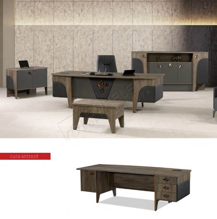 Cura Antrasit ofis masa takımı, hem dekorasyon hem de işlevsellik açısından ofisinizde fark yaratır. Şık antrasit tonları ve dayanıklı yapısıyla iş yerinizin stilini modern bir seviyeye taşıyın.